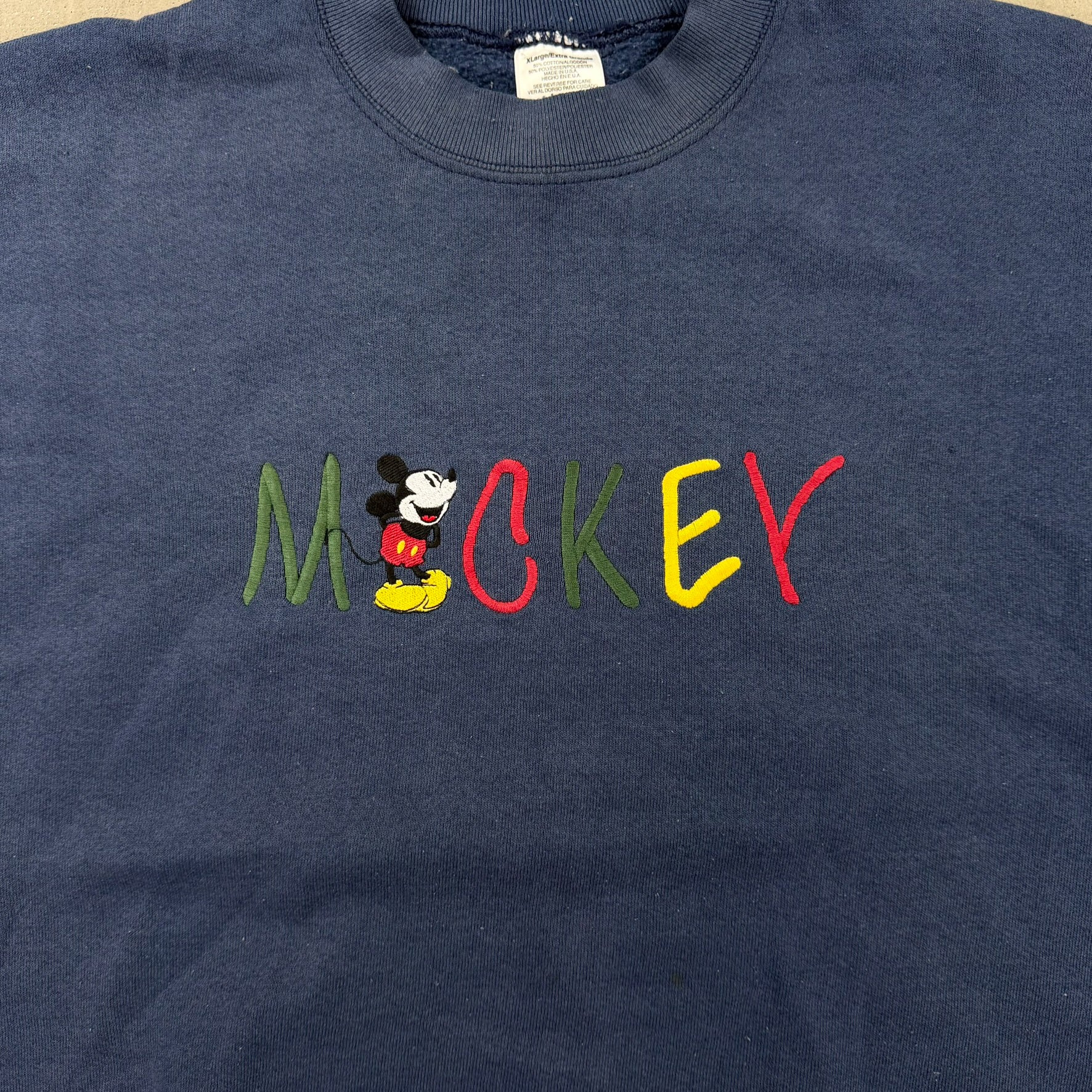 F- Vintage Disney Mickey Embroidered Text & Character Made In USA Crewneck