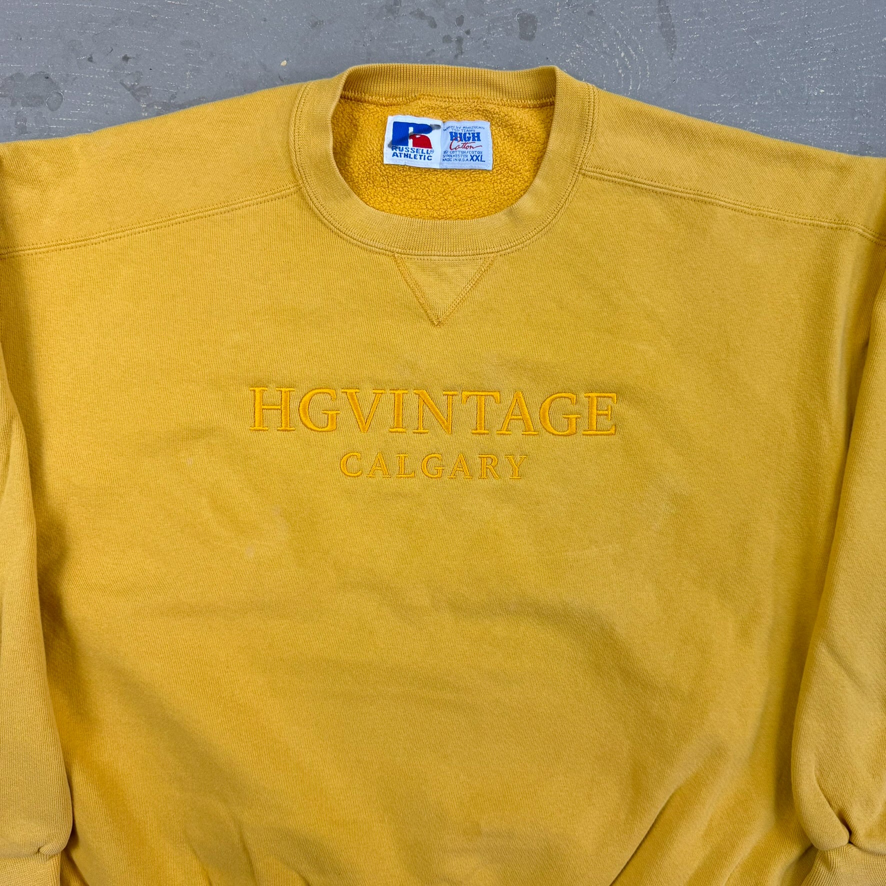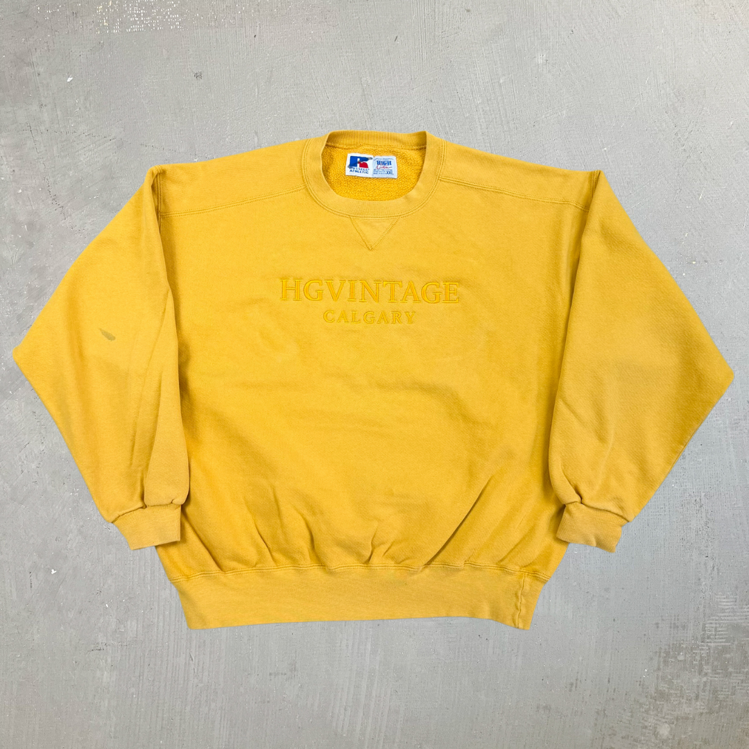 J- Vintage HG Vintage Calgary Embroidered Text Yellow Russell Made In USA Crewneck - 2XL