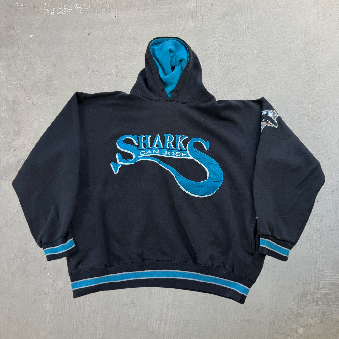 J- Vintage San Jose Shark NHL Starter Embroidered Text Hoodie - L